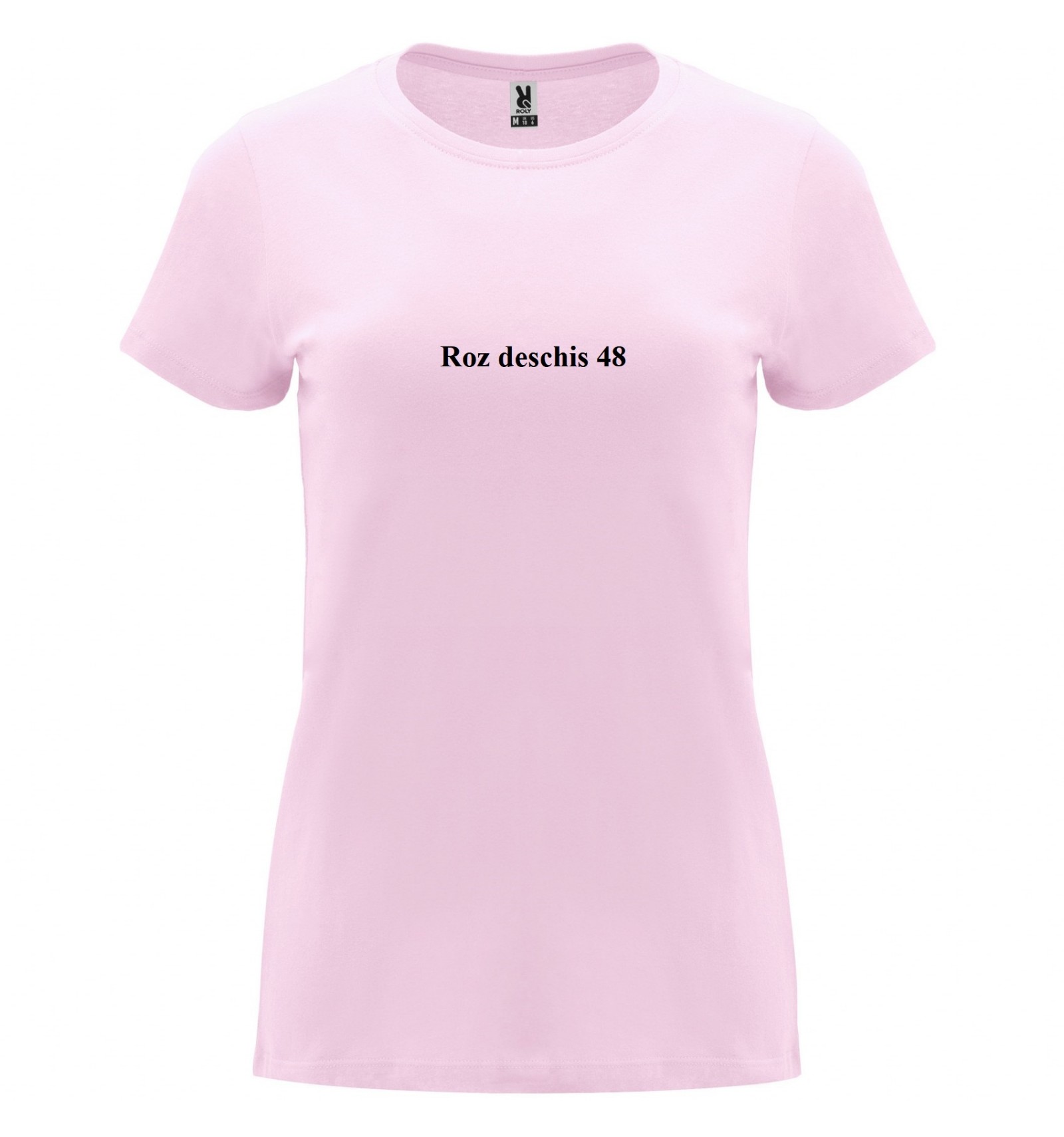 Tricou cu mânecă scurtă de damă. Guler rotund în canalé 1x1. Model cambrat. Bandă întărită pentru acoperirea cusăturilor la guler.
