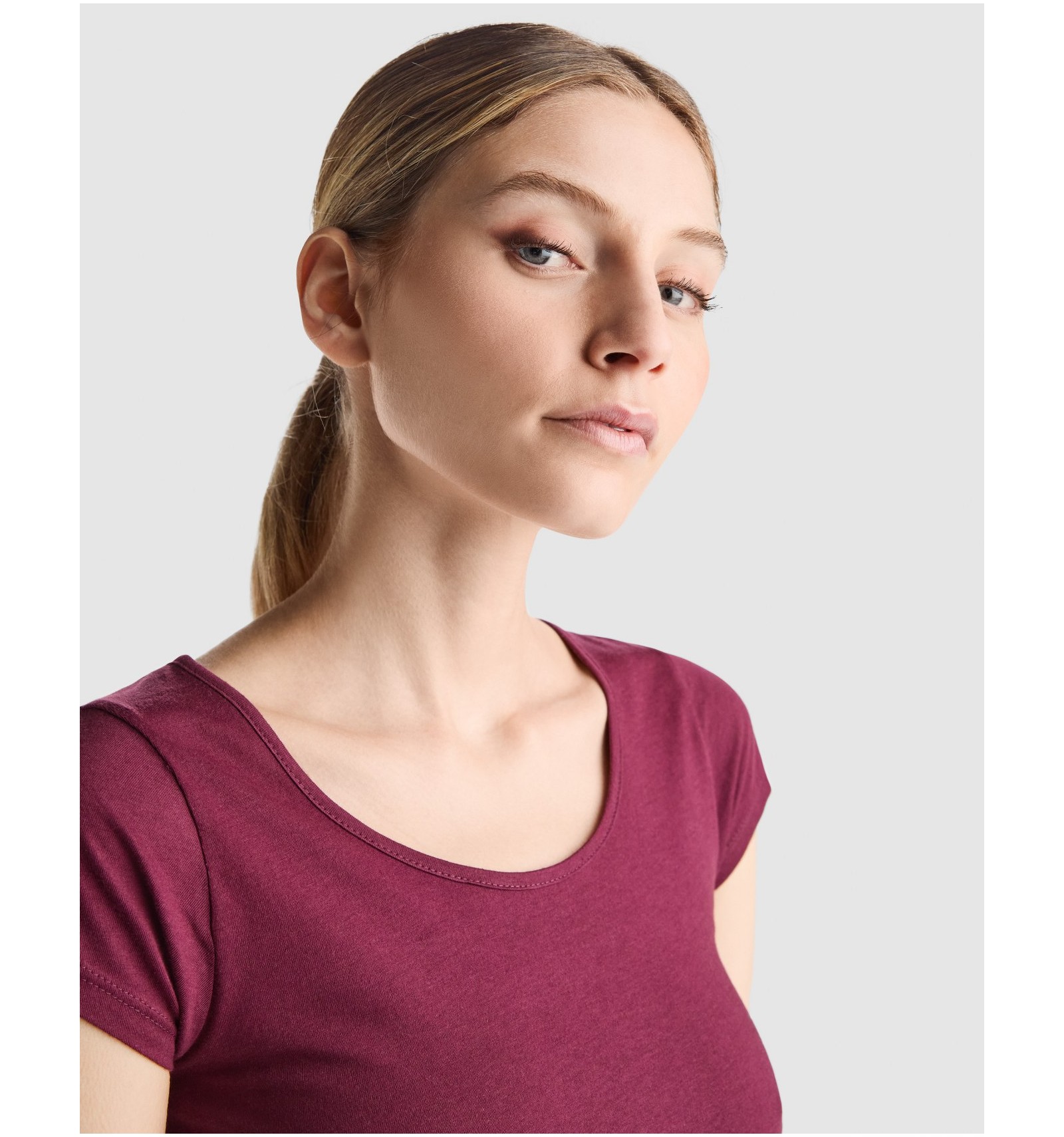 Tricou cambrat, cu mânecă scurtă și decolteu rotund și pronunțat, cu garnitură lată și răsucită. Cusaturi laterale.