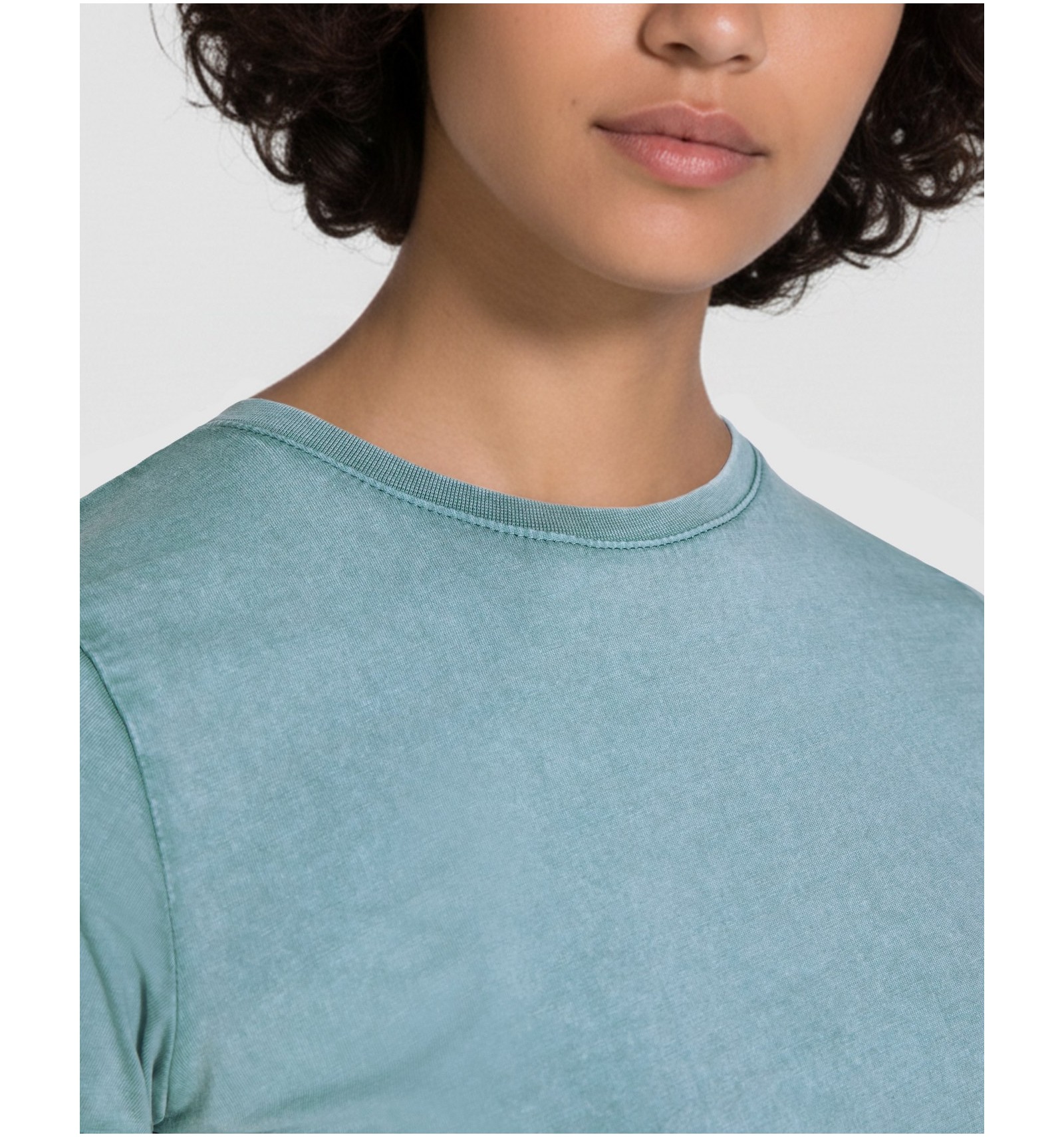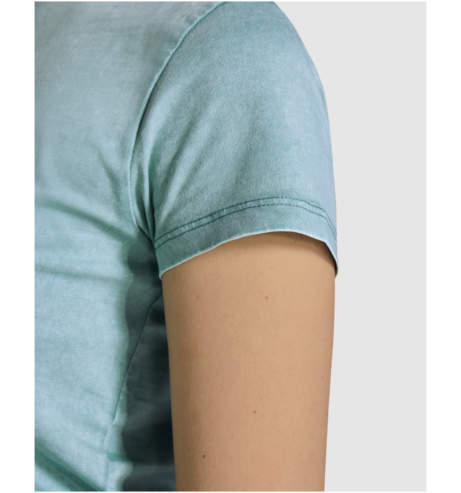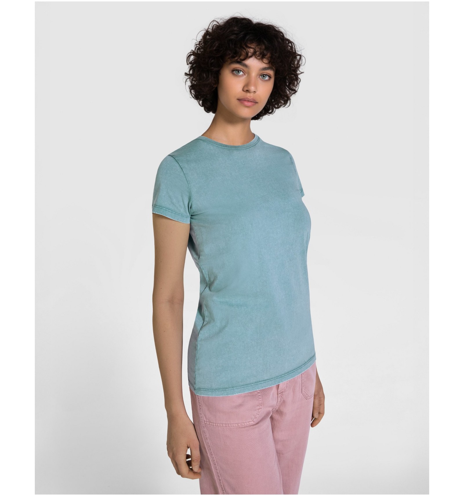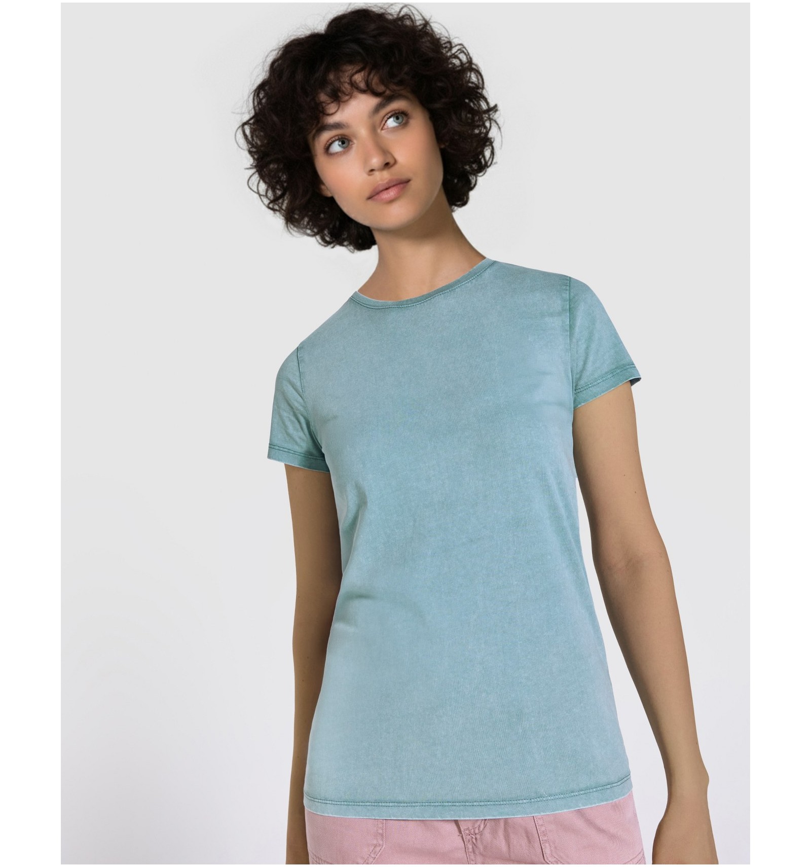 Tricou cu mânecă scurtă pentru femei. Bumbac pieptănat cu efect decolorat. Guler rotund cu nervuri 1x1.