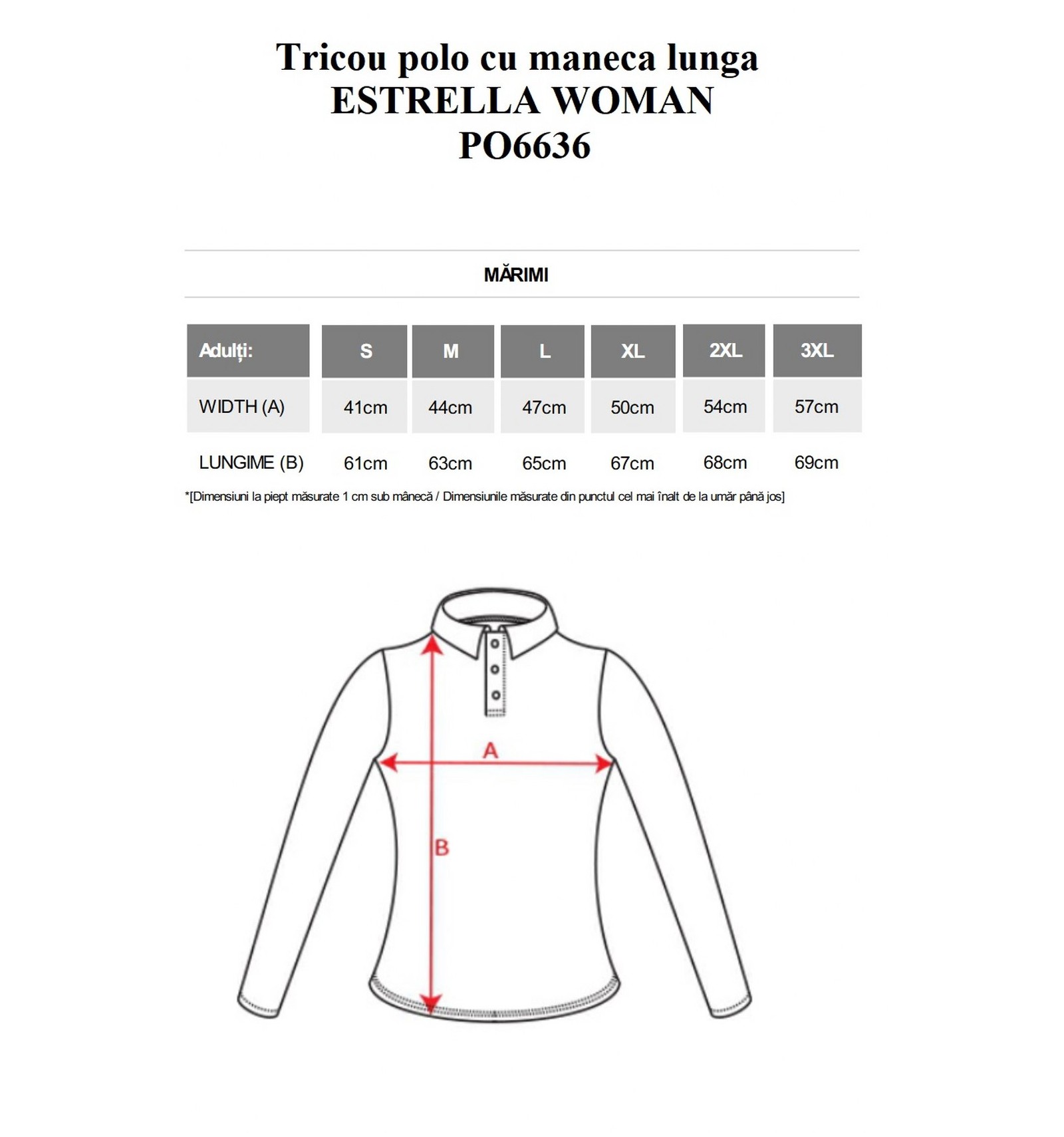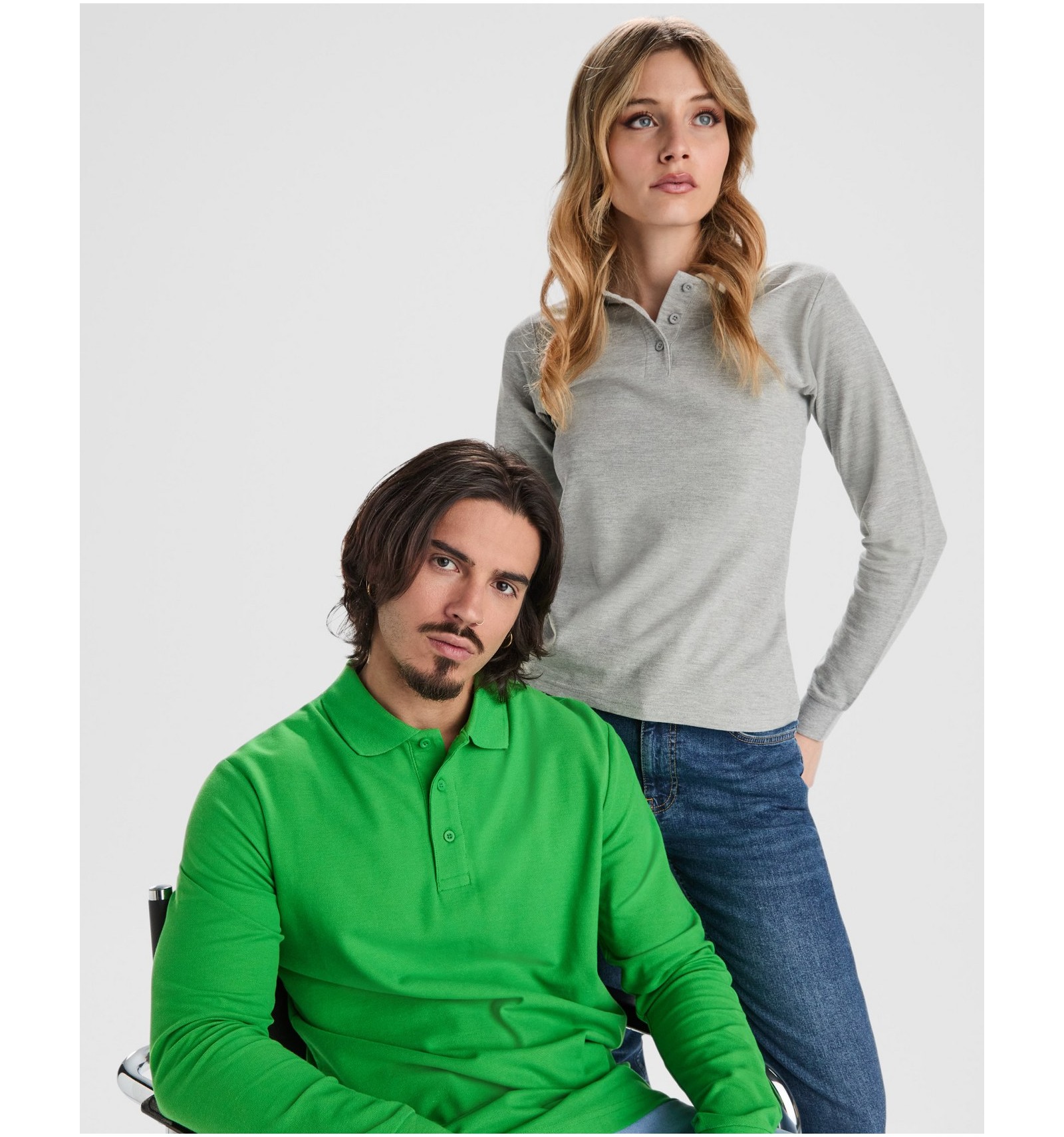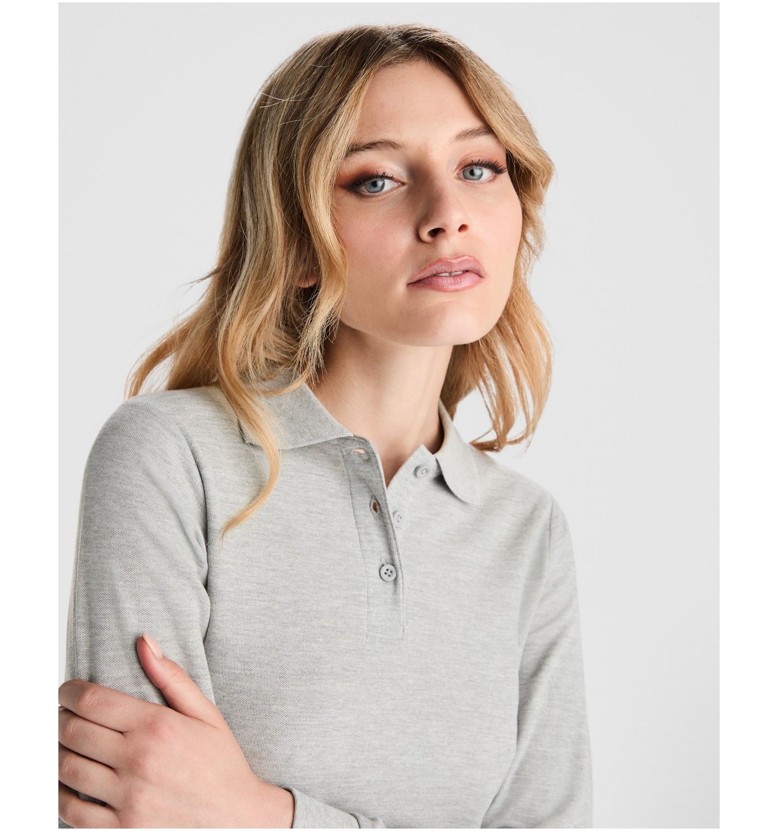 Tricou polo cu mânecă lungă, guler și manșete canelate 1x1 cu elastan și fantă cu 3 nasturi. Bandă întărită pentru acoperirea cusăturii la guler, croială cambrată.