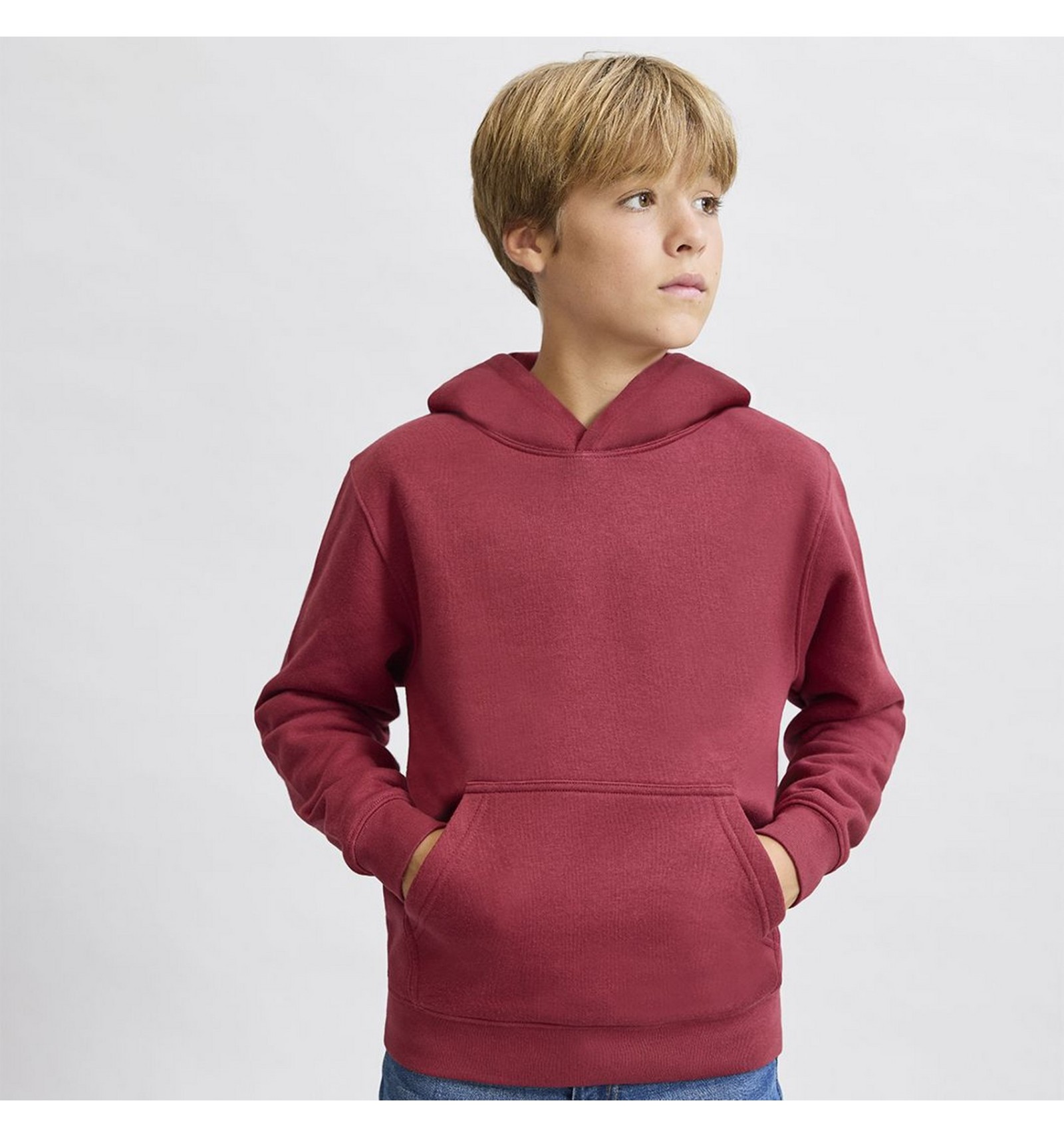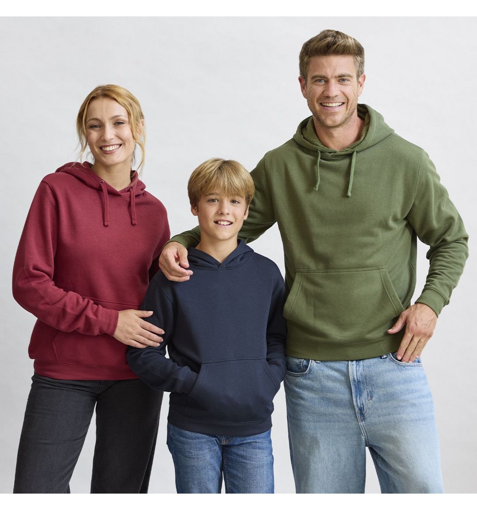 Include buzunar tip „kangaroo”, bandă de întărire la gât și manșete și talie tricotate 1x1 cu elastan pentru o potrivire și confort mai bune.