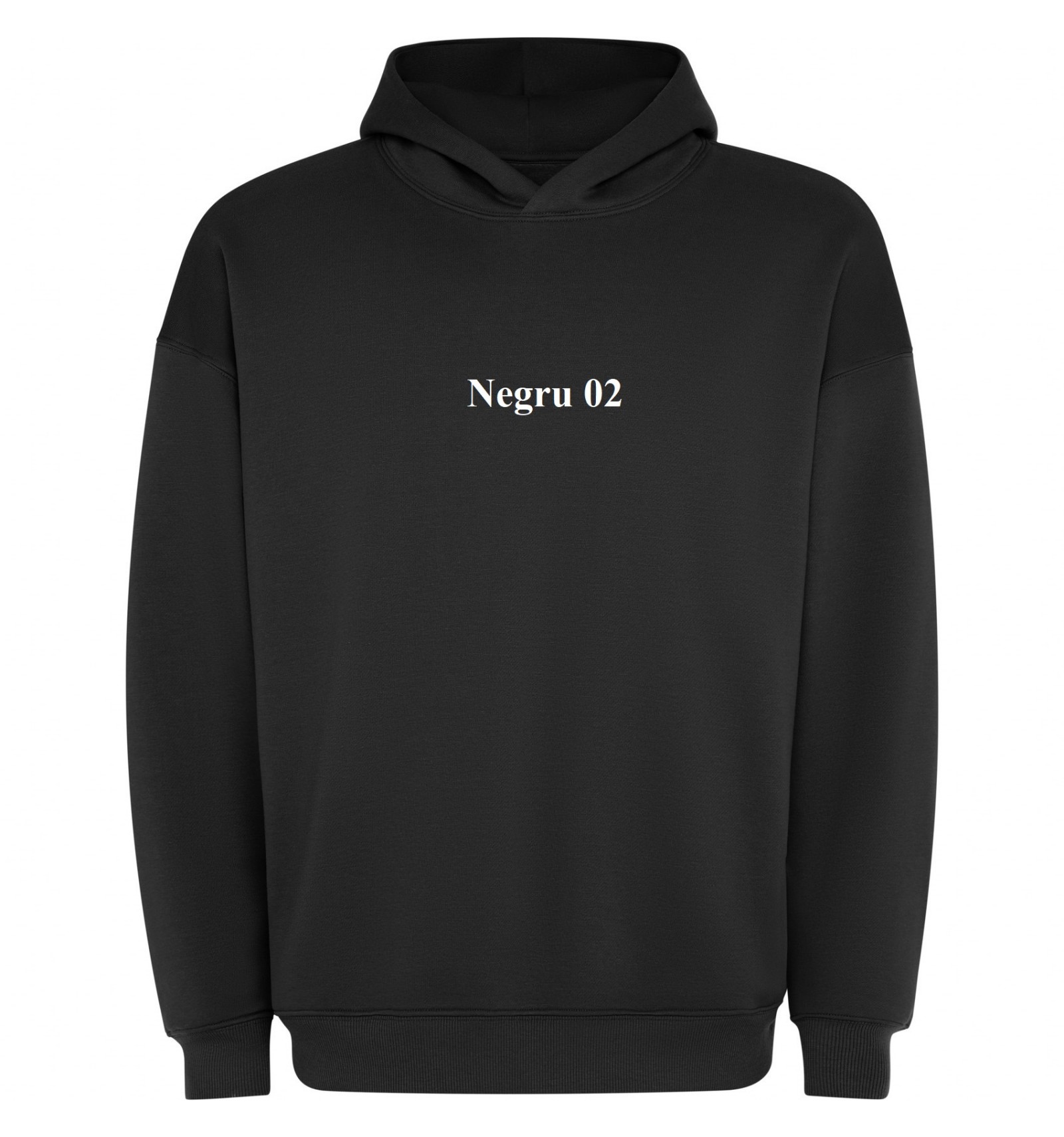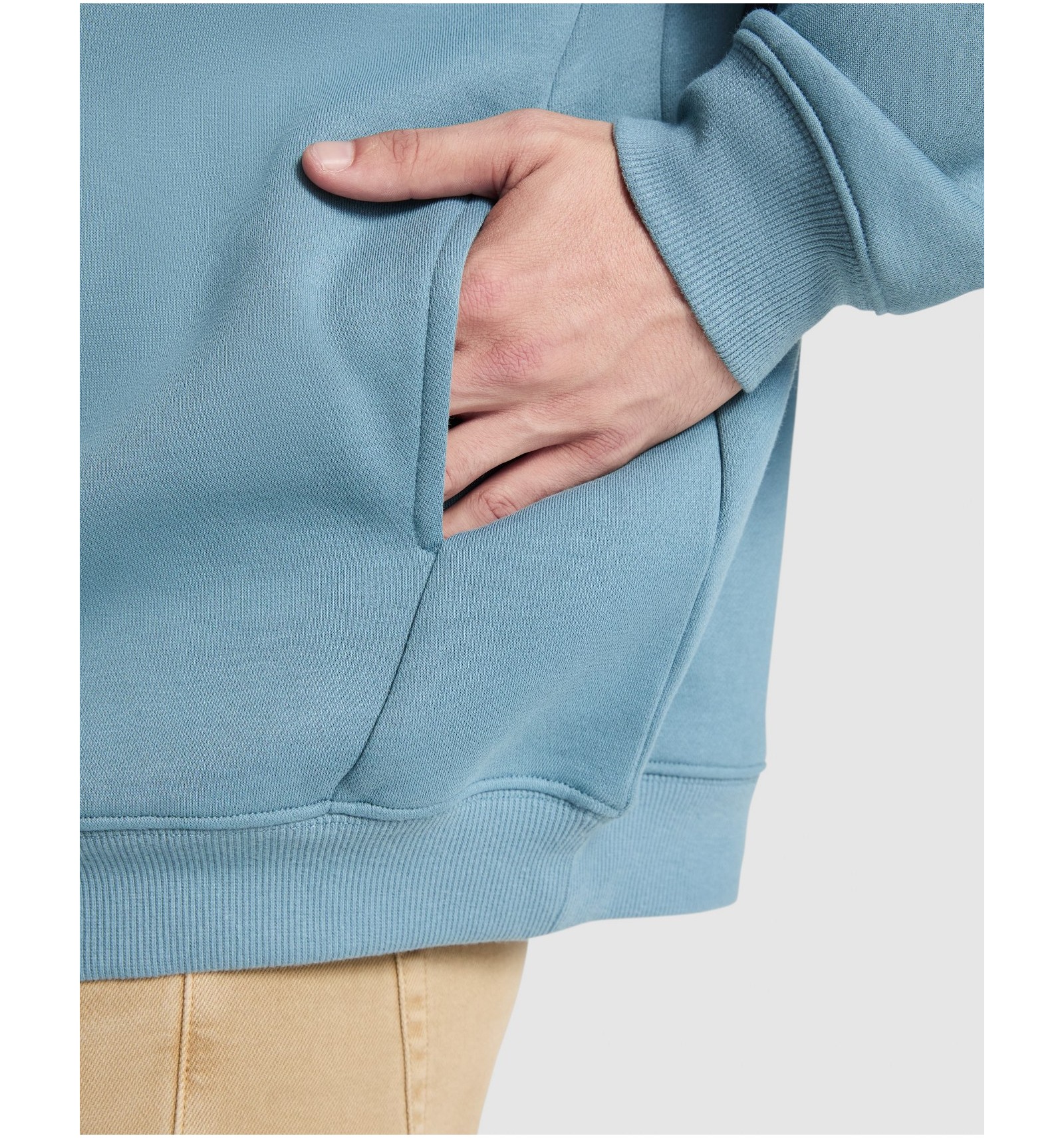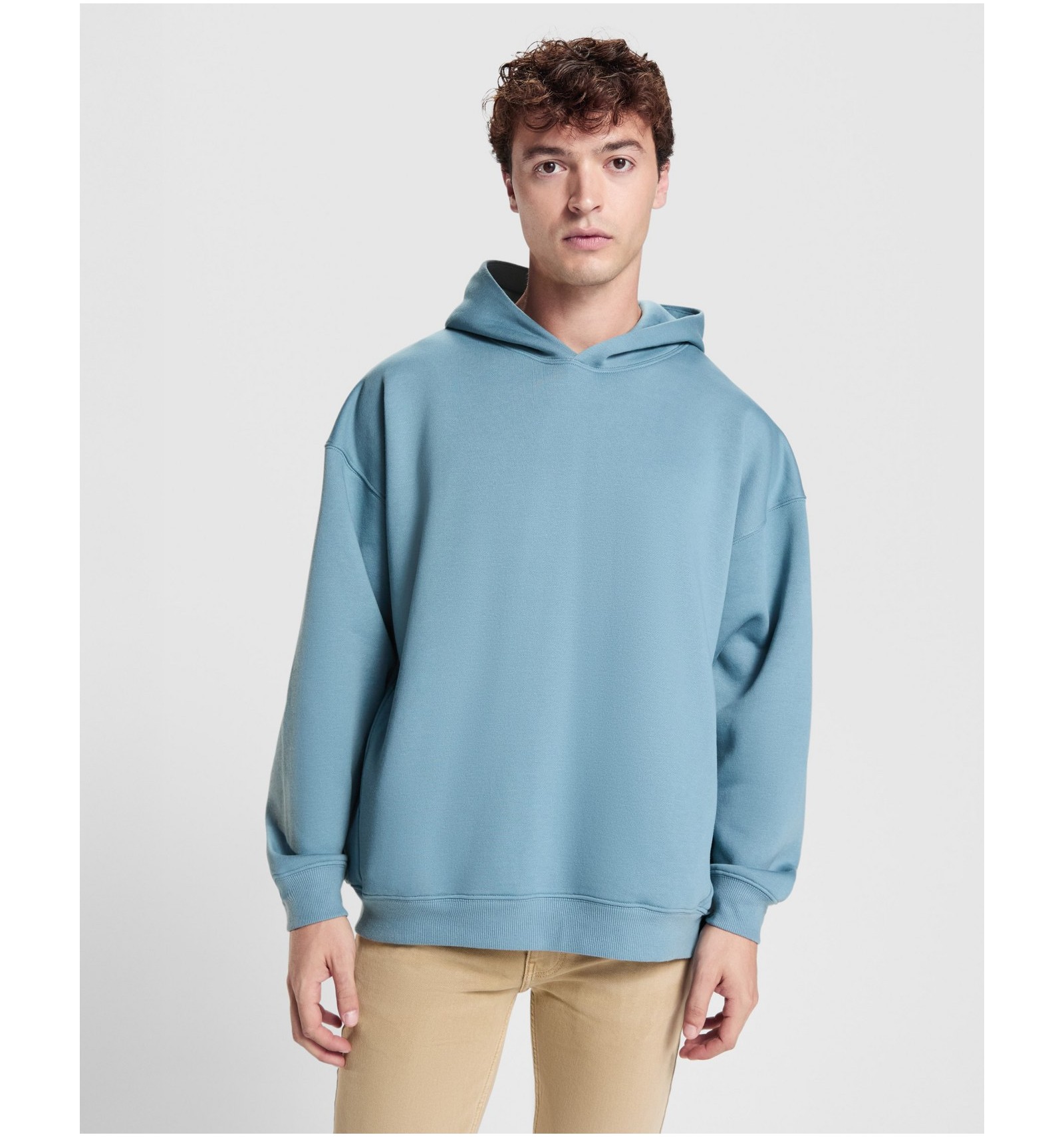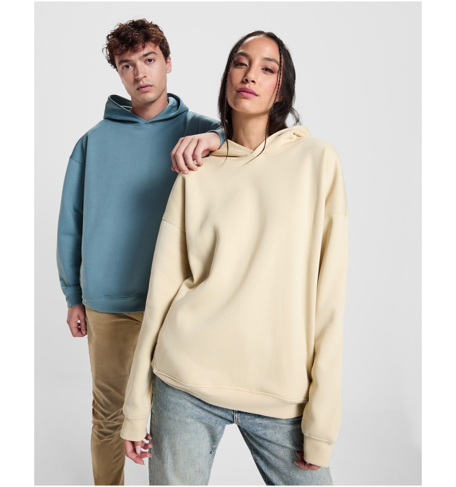 Hanorac unisex oversize, cu glugă căptușită din același material. Guler întărit cu bandă.
