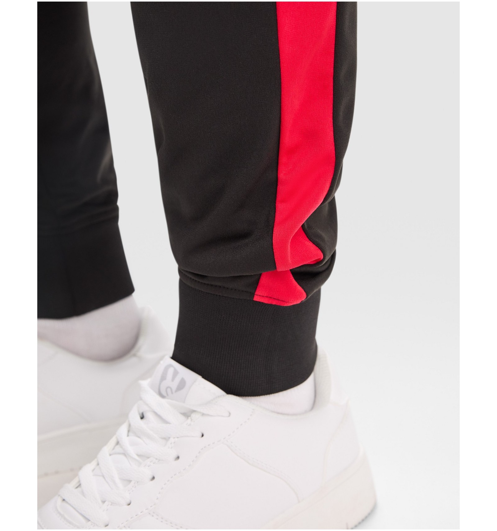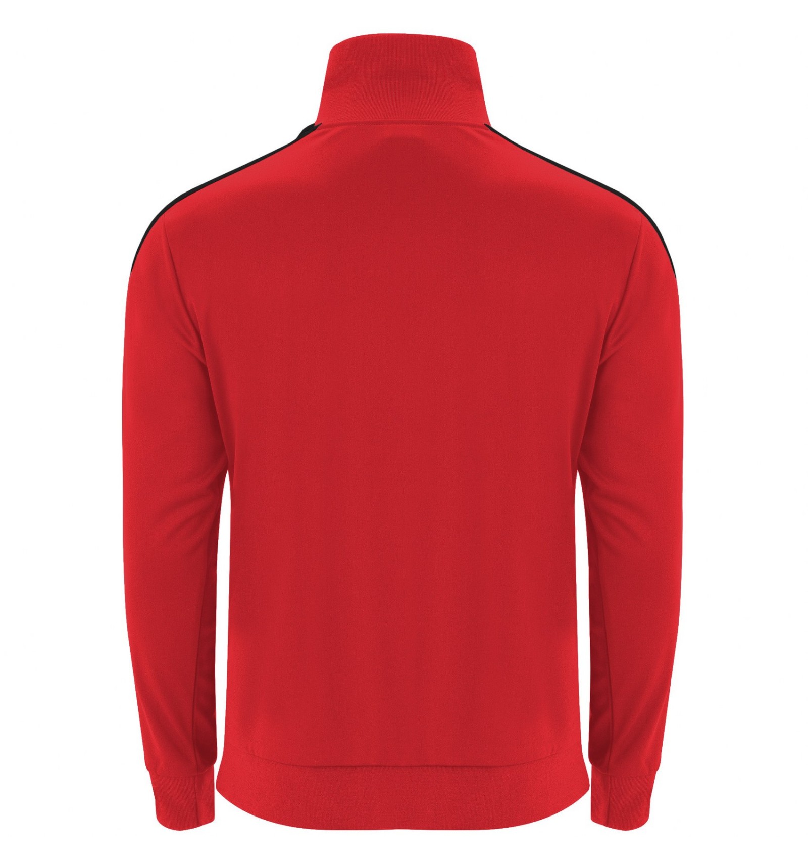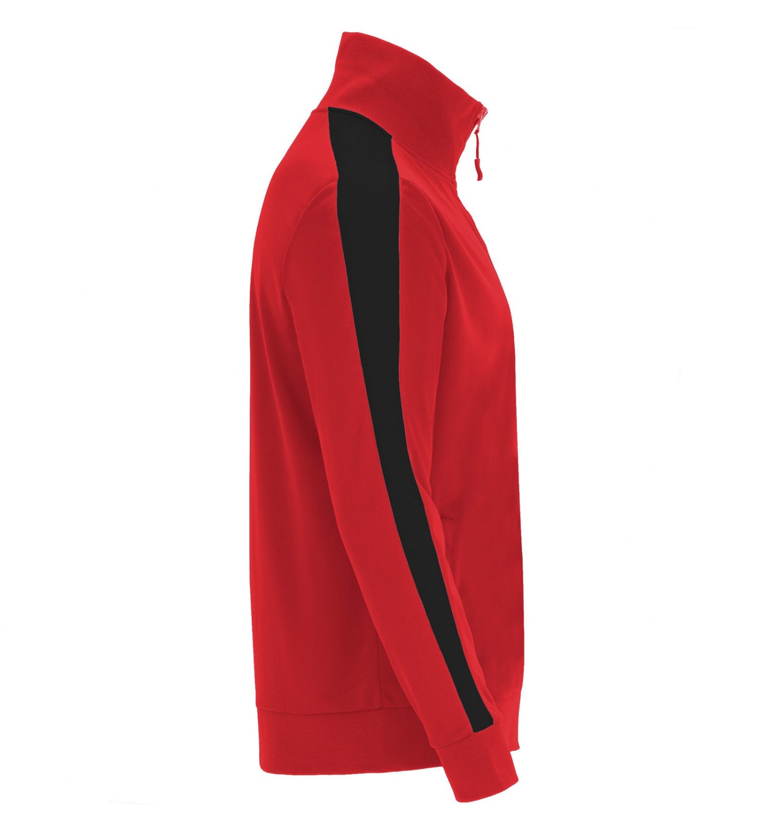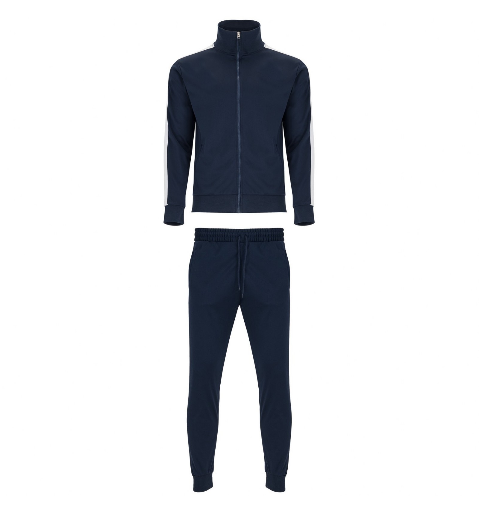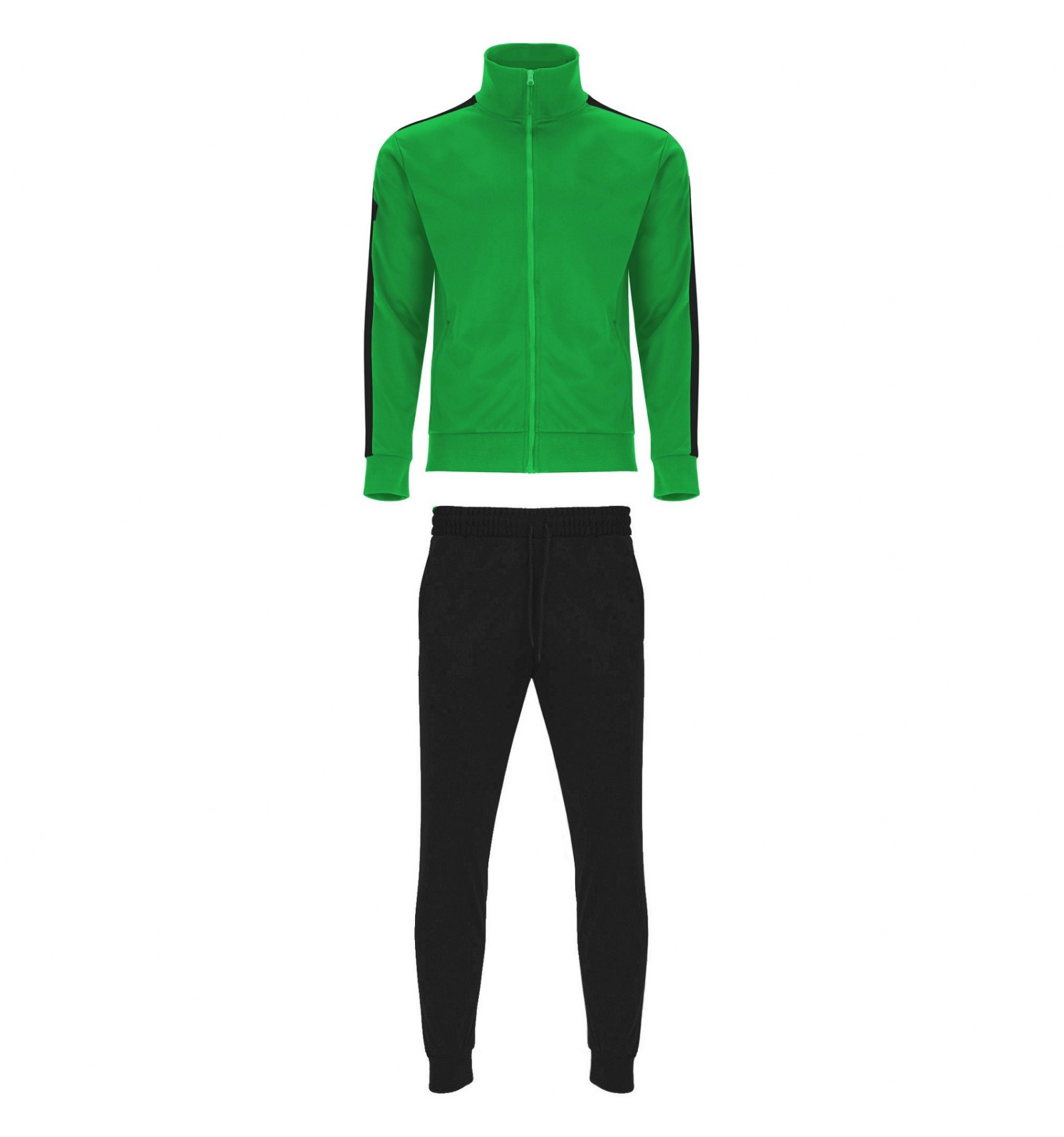 Trening format din două piese, bluză și pantaloni. 1. Guler înalt cu bandă de acoperire a cusăturilor la interior, de aceeași culoare cu gulerul. 2. Guler, manșete și talie în canalé 1x1. 3. Fermoar pe mijloc cu cheiță. 4. Bluză cu buzunare laterale cu fermoar. 5. Bandă laerală în contrast de culoare. 6. Pantaloni cu betelie elastică în talie și șnur reglabil. 7. Două buzunare laterale. 8. Buzunar la spate cu fermoar. 9. Pantaloni cu manșetă elastică în canalé 1x1.