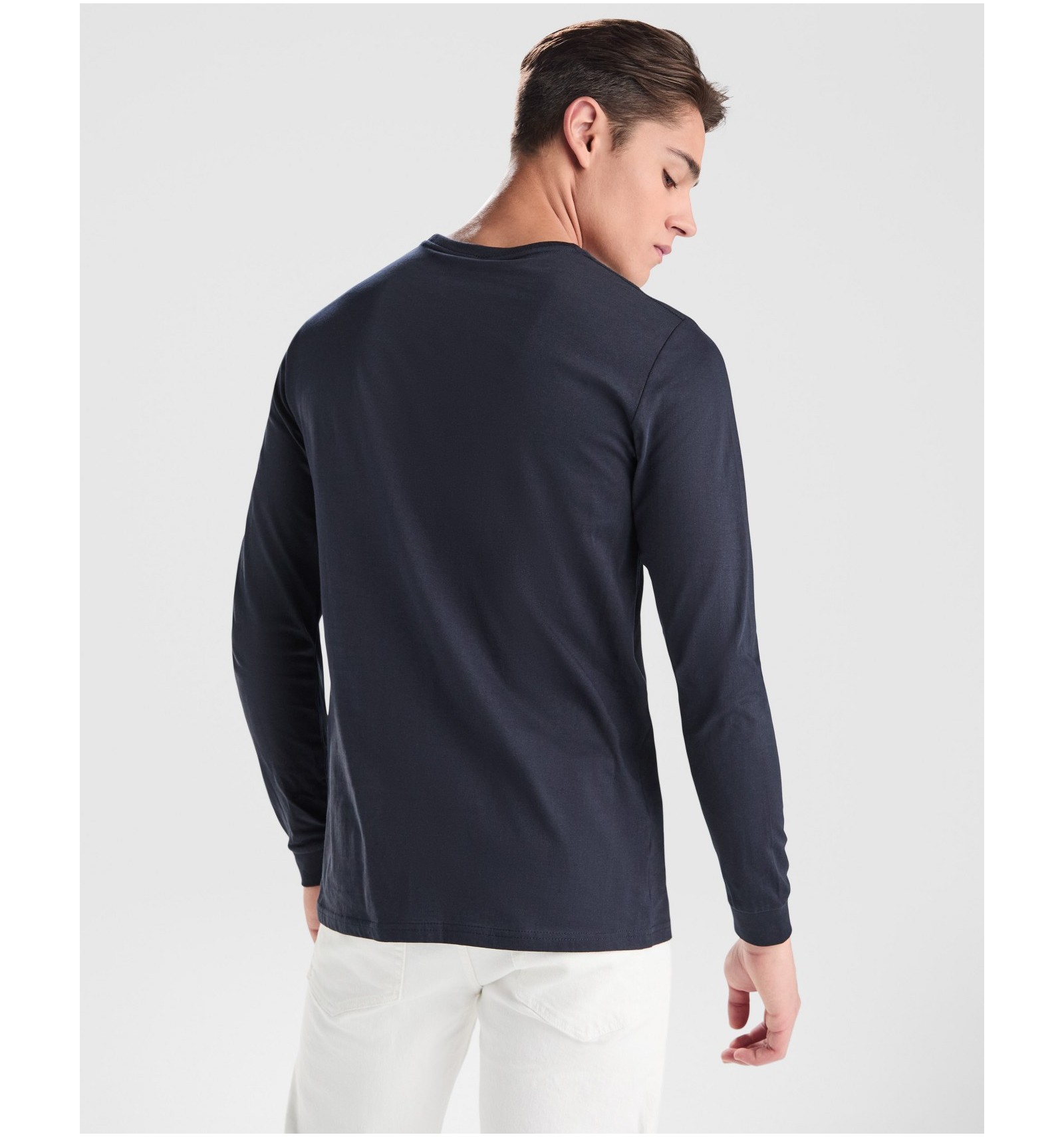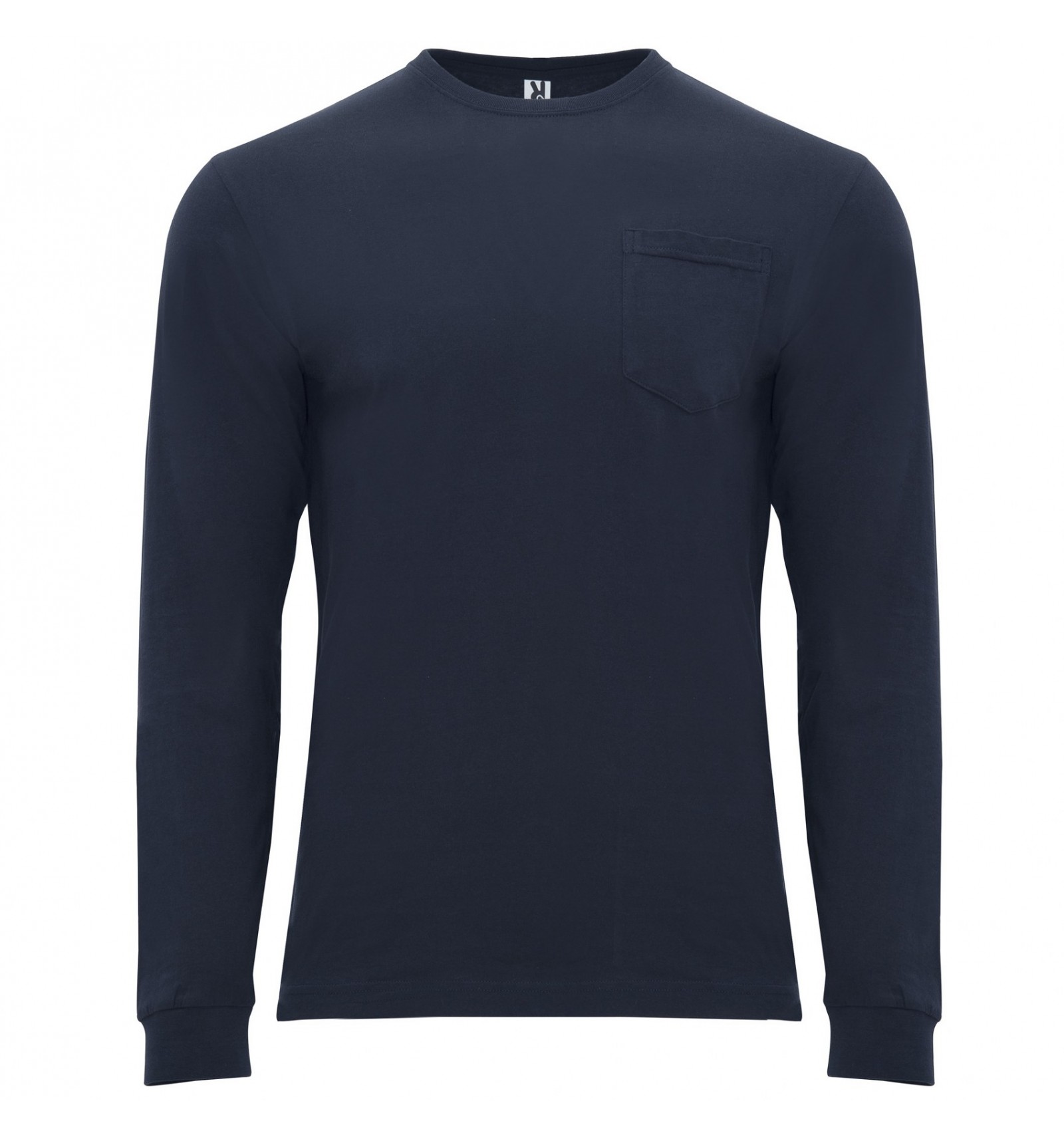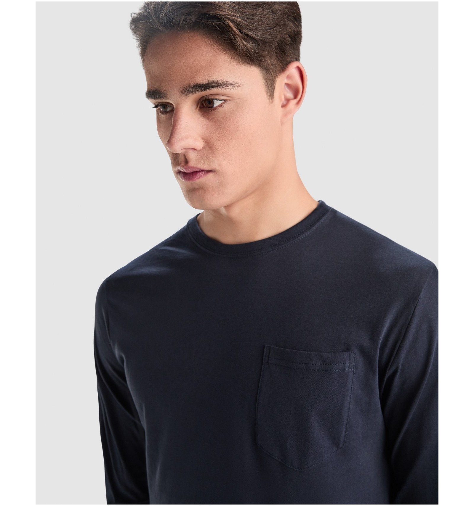 Tricou cu mânecă lungă, guler rotund și manșete în canalé 1x1. Buzunar la piept în partea stângă. Bandă întărită pentru acoperirea cusăturii la guler și umeri.