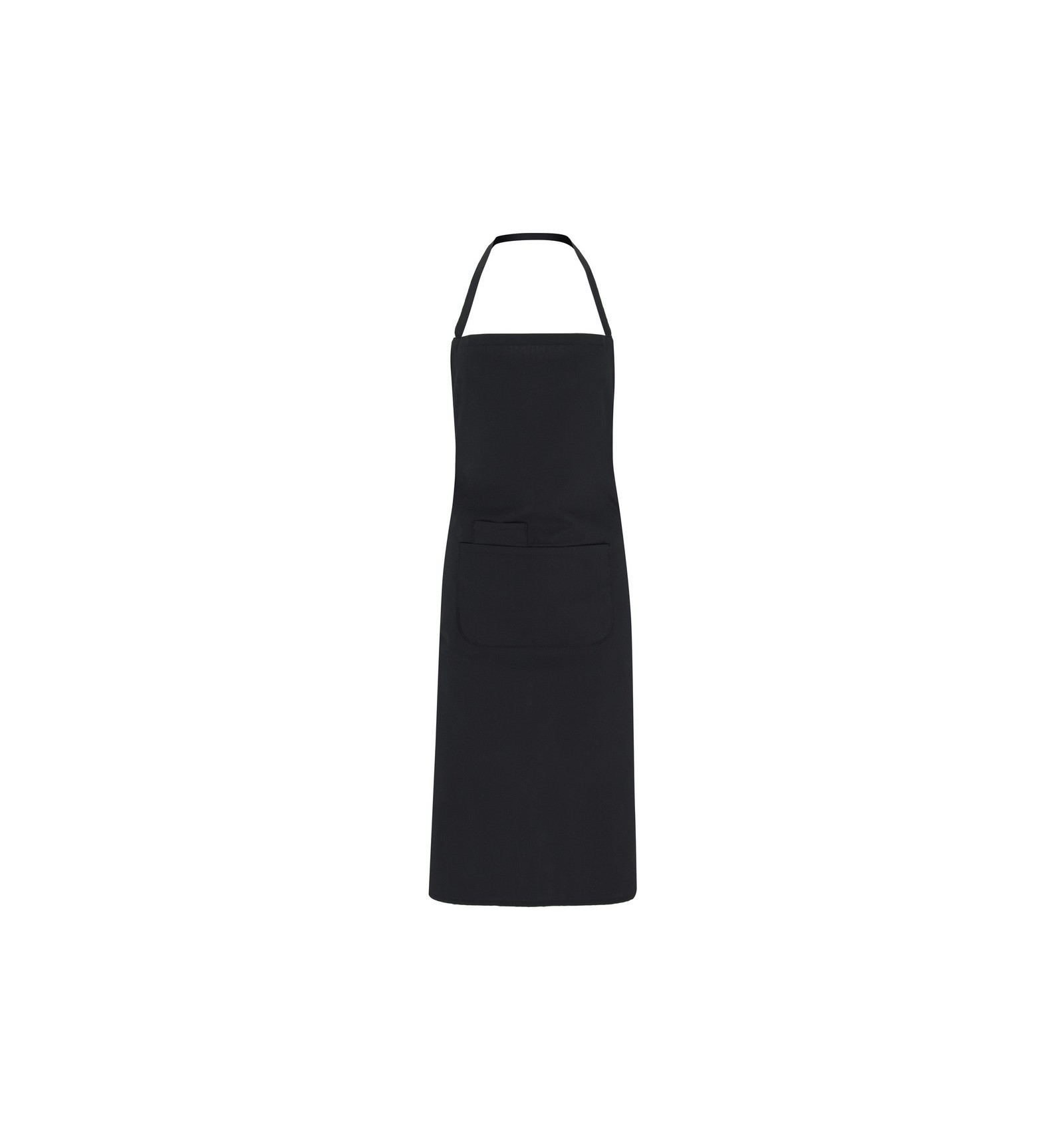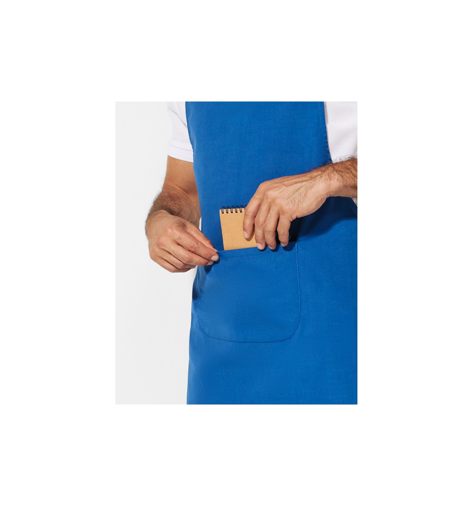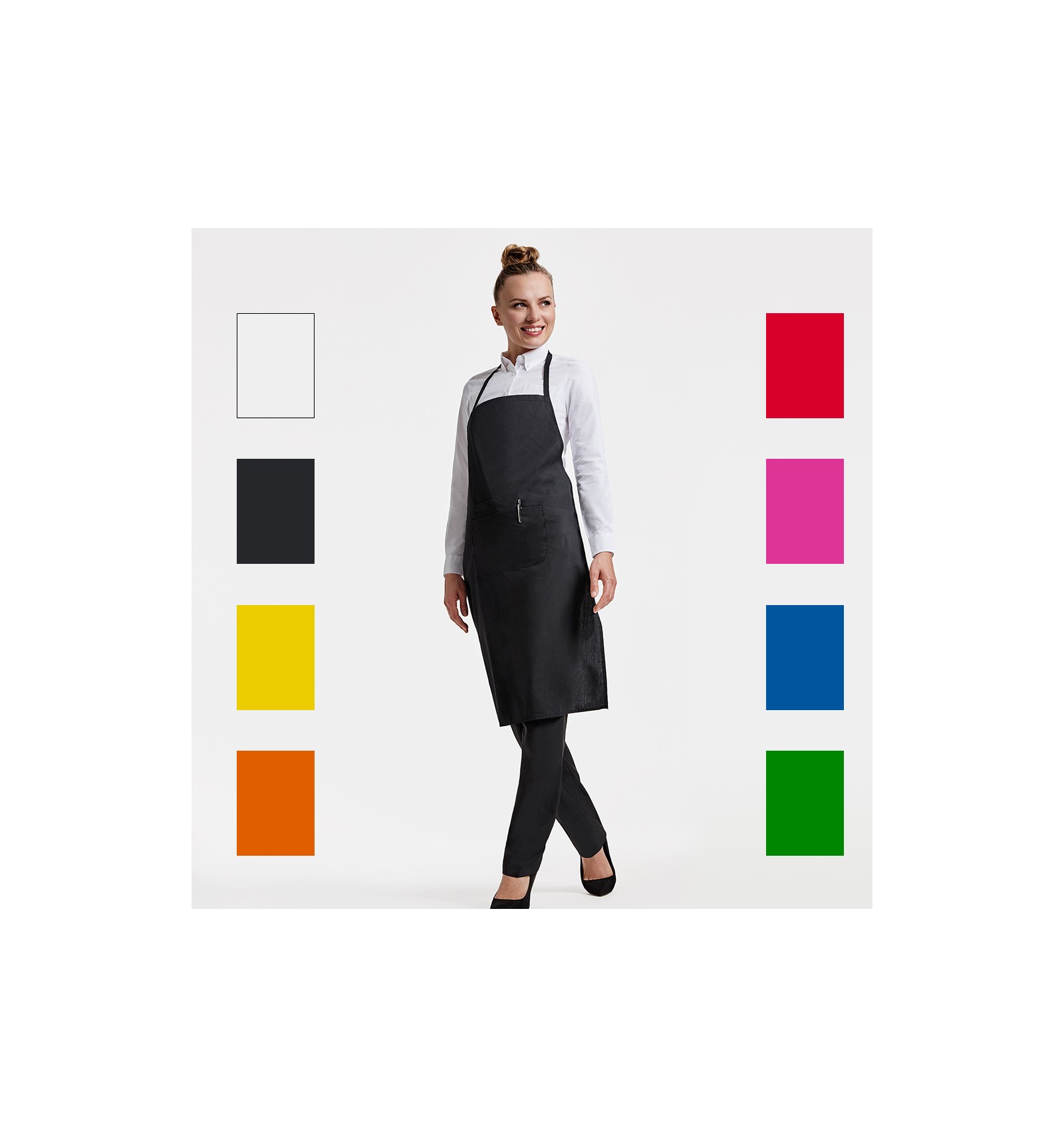 Șorț lung. 1. Bretea la gât de aceeași culoare. 2. Două buzunare în față, unul interior și unul mare suprapus. 3. Bretele laterale.