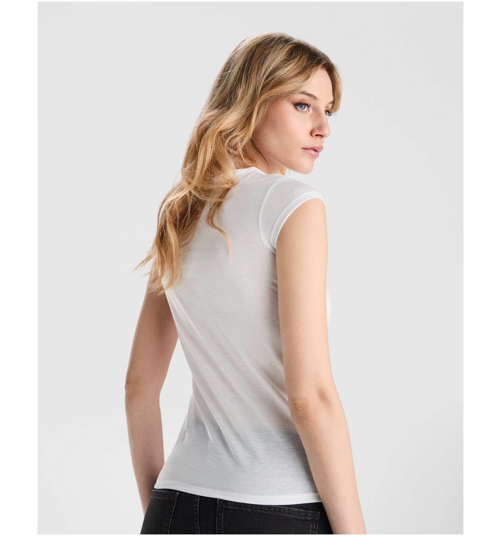 Tricou cambrat cu mânecă scurtă și guler rotund cu garnitură din același material. Are cusături laterale. Fabricat din poliester însă de tact bumbac
