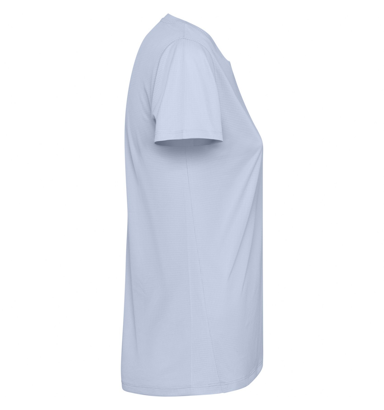 Tricou tehnic cambrat de damă cu mânecă scurtă. Guler cu cusături în aceeași culoare.